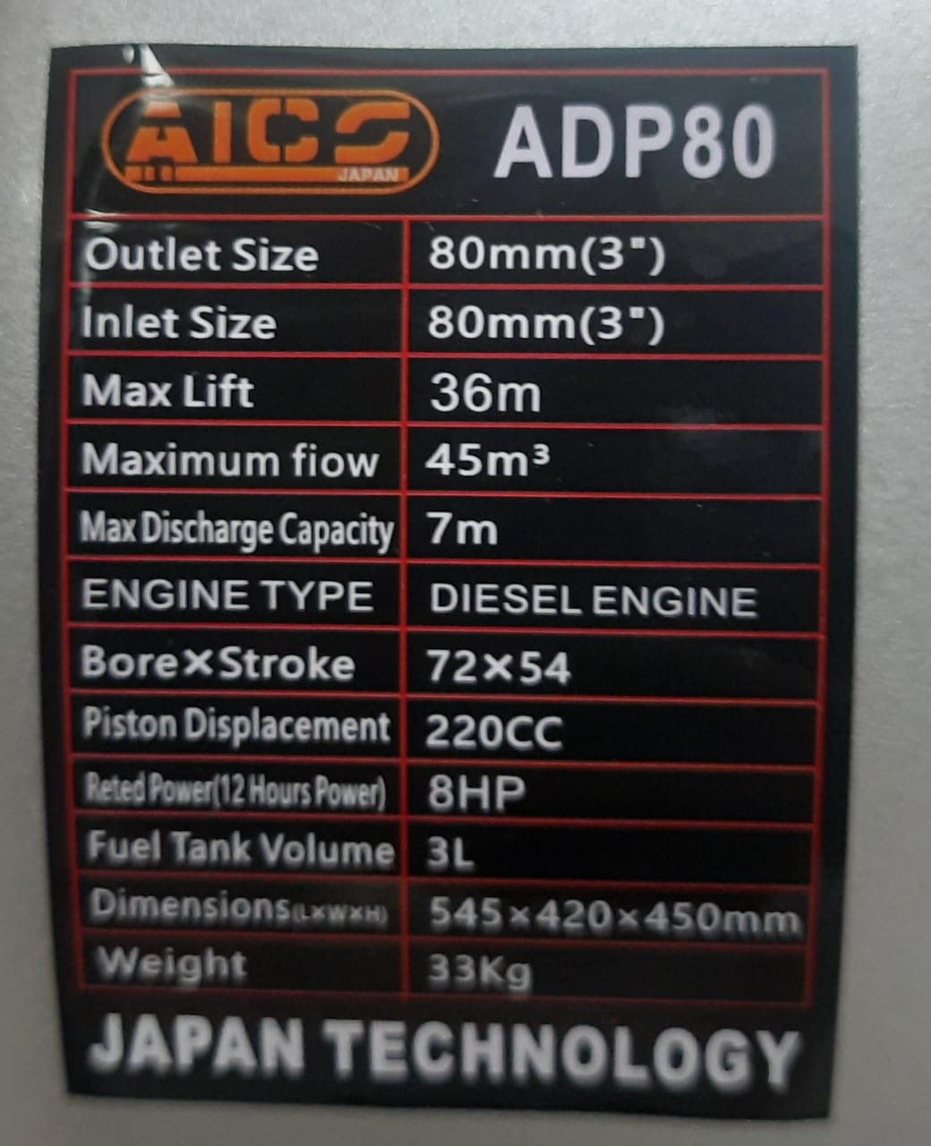ADP80 Aico Japan DIESEL water pump 3 inches NORMAL PRESSURE 8HP Engine