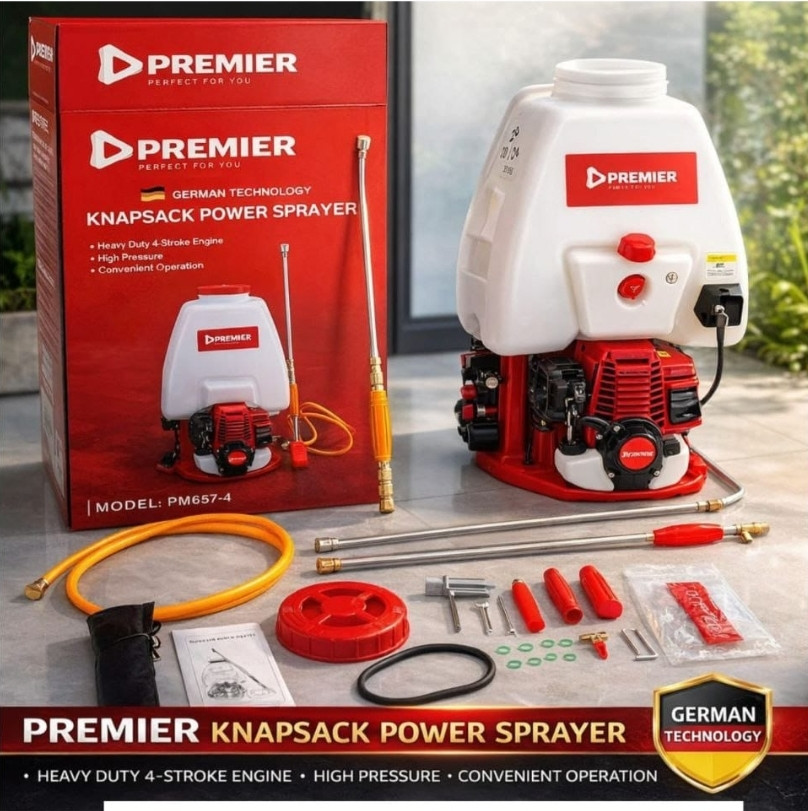 The Premier Knapsack Engine Sprayer combines high capacity with powerful performance, and a reliable 4-stroke engine. This sprayer is ideal for large-scale outdoor spraying tasks, including pest control, fertilization, and irrigation. The 4-stroke engine ensures efficient fuel use and consistent performance, while the ergonomic knapsack design allows for comfortable operation over extended periods. Built for durability, this sprayer is suited for both professional and residential use. Premier 4-Stroke Knapsack Sprayer/ Powerful EnginePowered by a 4-stroke engine, it delivers reliable and efficient spraying for various applications.The ergonomic knapsack design ensures comfort during long operations, making it suitable for extensive use in gardens, farms, and other outdoor environments.Features:Powerful 4-stroke engineComfortable backpack designEasy to startLow maintenanceGerman technologyBenefits:Powerful and reliableIdeal for a variety of applicationsEasy to start and maintainCost-effectiveBuilt with German engineering for superior quality and performance Specifications:Engine: 4-strokeHigh Flow rateHigh Pressure