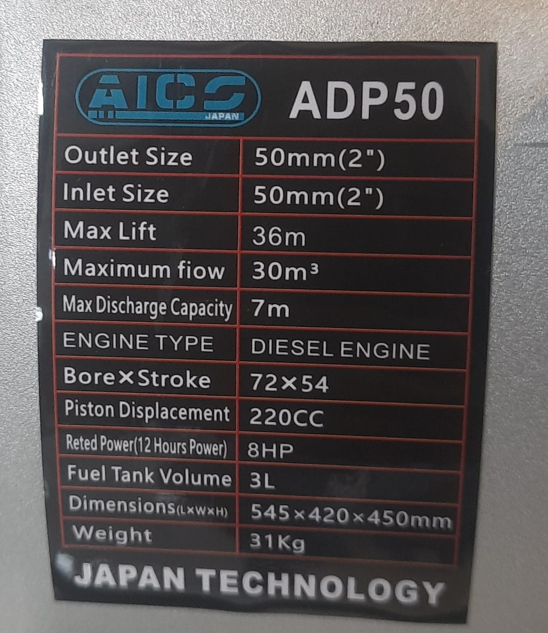 ADP50 Aico Japan DIESEL water pump 2 inches NORMAL PRESSURE 8HP .