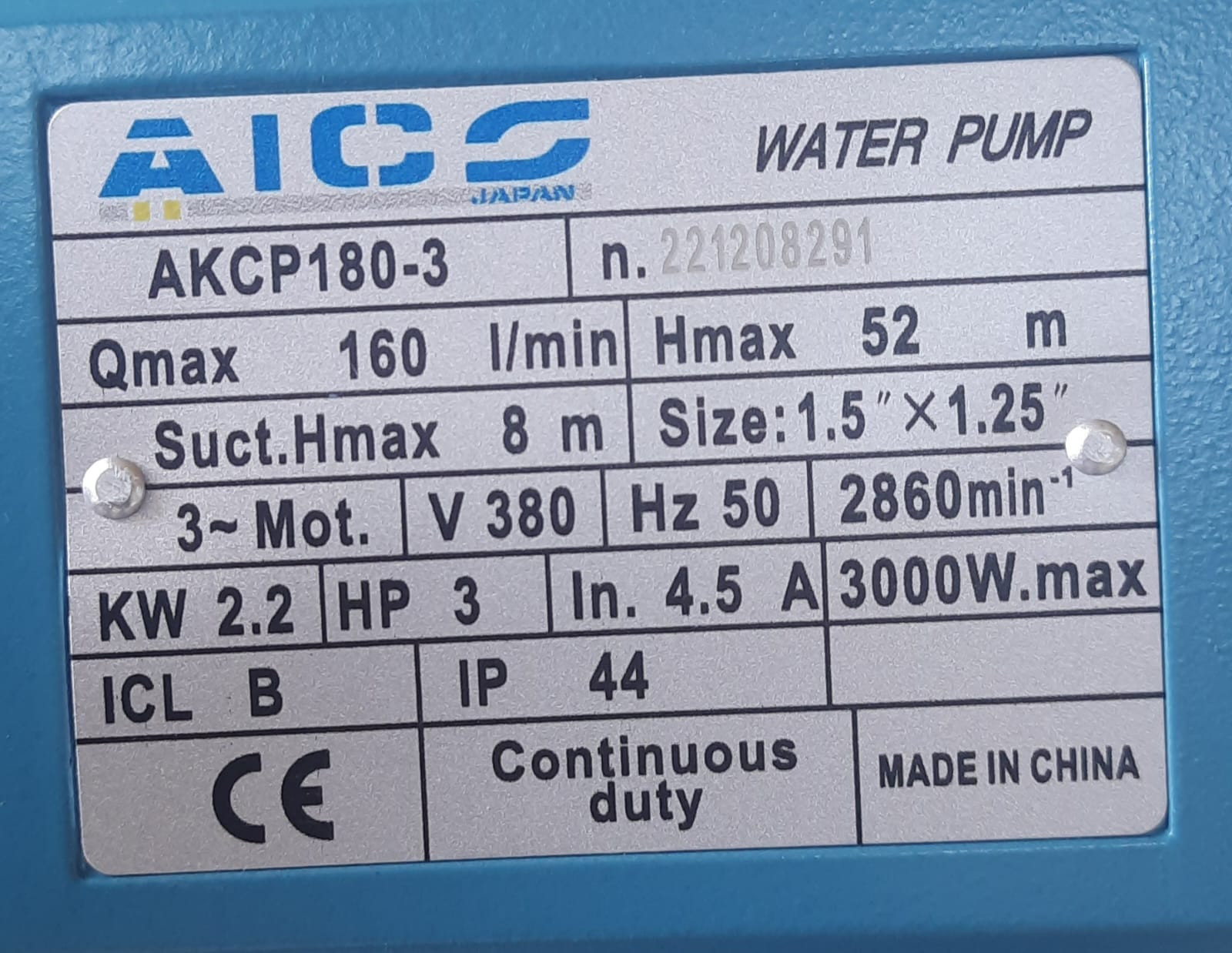 -AKCP180 Aico Japan Booster pump 3HP Head 52 metres 1.5 inches Volume 160L/min